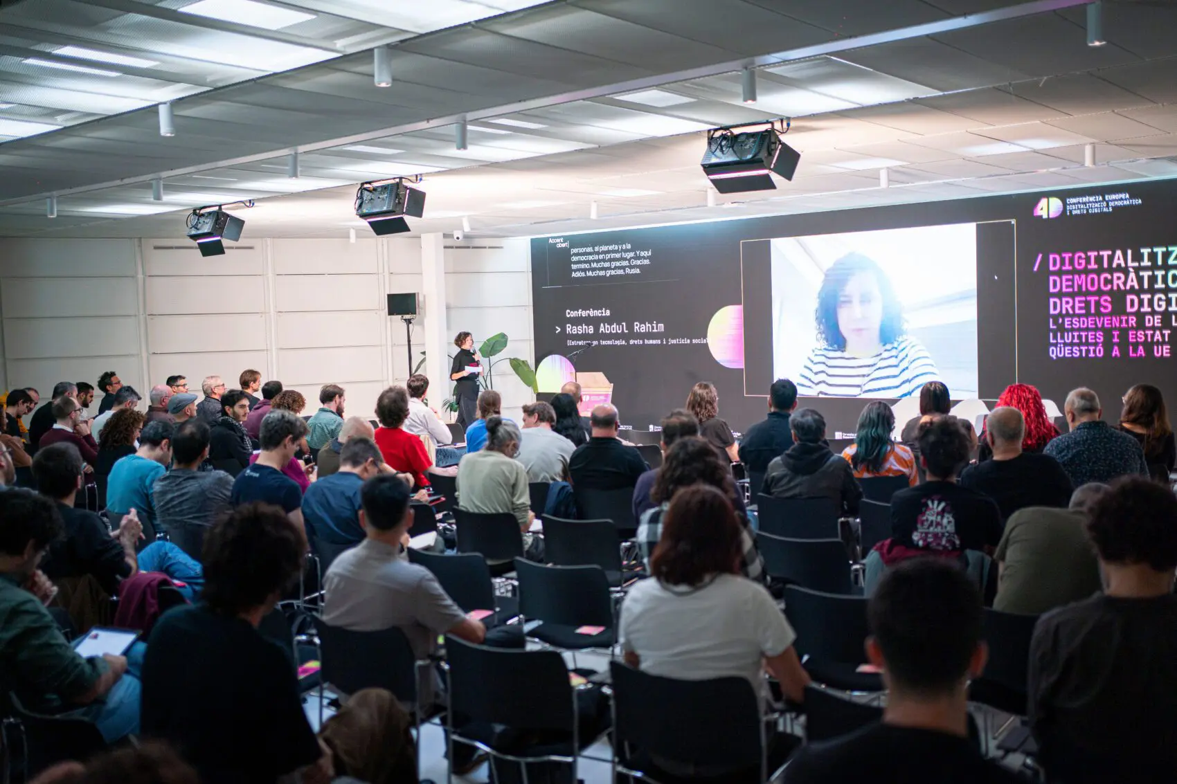 A la ponència inaugural, Rasha Abdul Rahim, estratega en tecnologia i drets humans, va analitzar com enfrontar-se als monopolis tecnològics i als corrents de desregulació impulsats per governs que donen cobertura a les grans corporacions. Va reivindicar la necessitat de “fer servir els marcs legals de la Unió Europea per defensar una Internet justa, oberta i plural”.